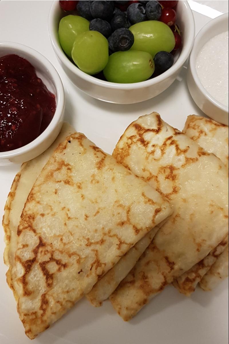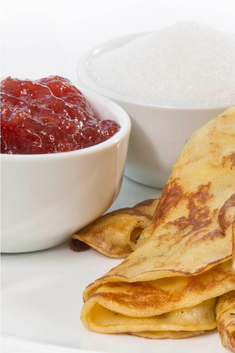 Vår pannekake serveres med 3 pannekaker, syltetøy (bringebær eller jordbær) og sukker.