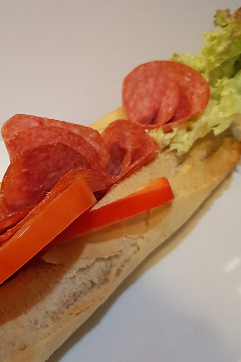 Vår baguette med salami, brie og soltørket tomat smøres med smør, salat, salami, brie, agurk, paprika, soltørket tomat og alfalfaspirer. Skriv en kommentar om det ønskes glutenfri variant eller andre tilpasninger.