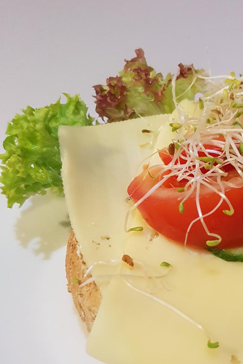 Vårt halve rundstykke (grovt) smøres med smør, salat, ost, agurk, tomat og alfalfaspirer. Skriv en kommentar om det ønskes glutenfri variant eller andre tilpasninger.