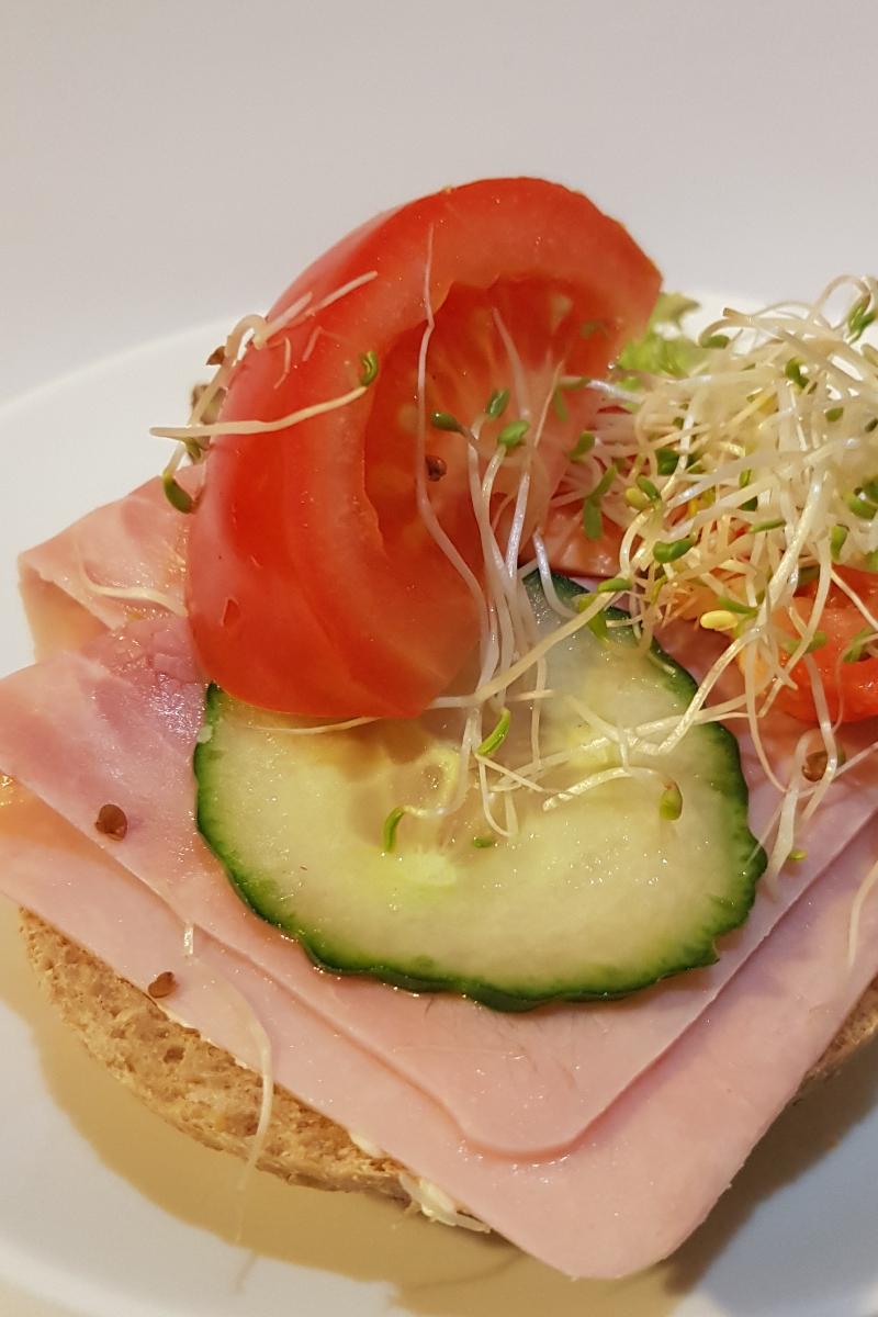 Vårt halve rundstykke (grovt) smøres med smør, salat, skinke, agurk, tomat og alfalfaspirer. Skriv en kommentar om det ønskes glutenfri variant eller andre tilpasninger.