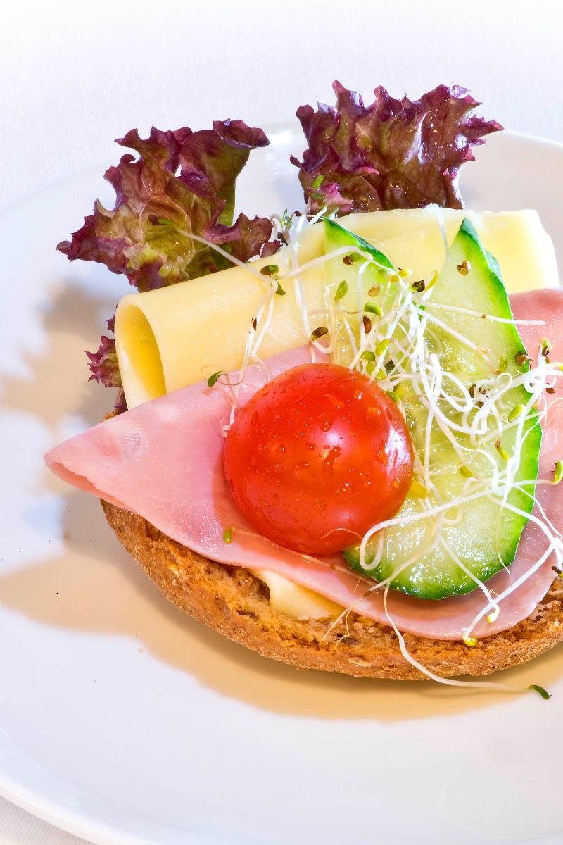 Vårt halve rundstykke (grovt) smøres med smør, salat, ost, skinke, agurk, tomat og alfalfaspirer. Skriv en kommentar om det ønskes glutenfri variant eller andre tilpasninger.